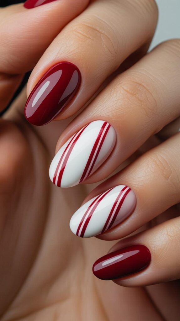 Crisp white nails host bold red candy cane stripes, creating a clean, graphic look. The glossy finish enhances the contrast and festive energy.