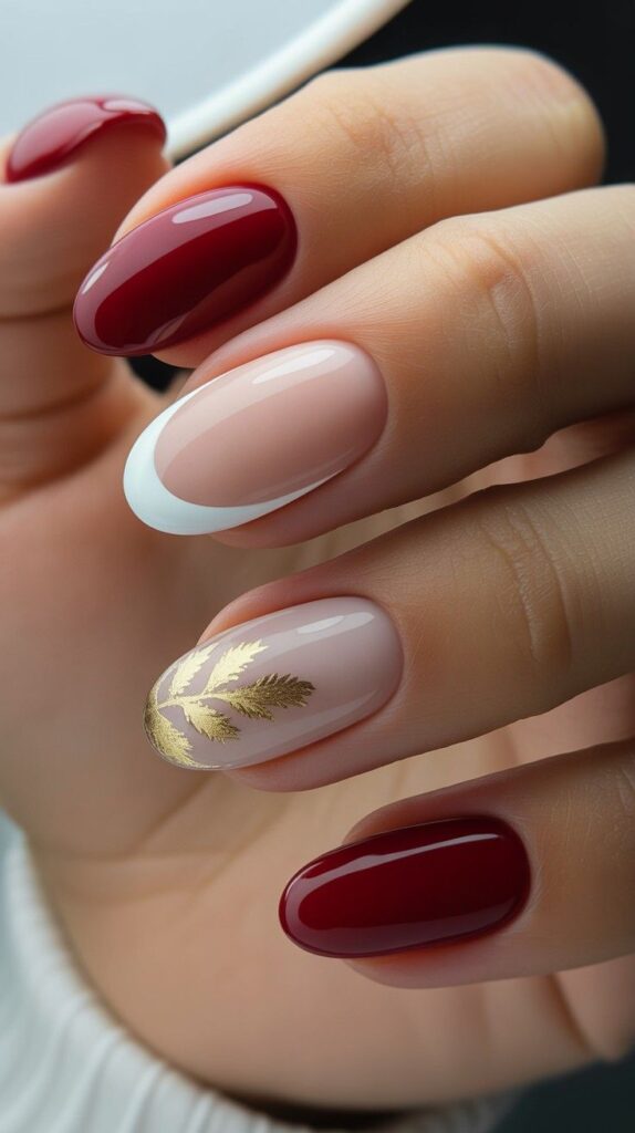 Soft nude nails feature delicate gold leaf decals, paired with rich red polish on two accent nails. The glossy finish enhances the clean lines and festive charm.