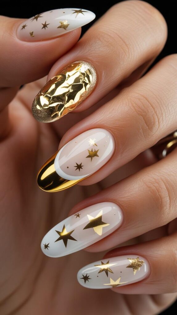 Crisp white nails host large gold stars, creating a clean, elegant look. The glossy finish enhances the dimensional elements and festive energy.