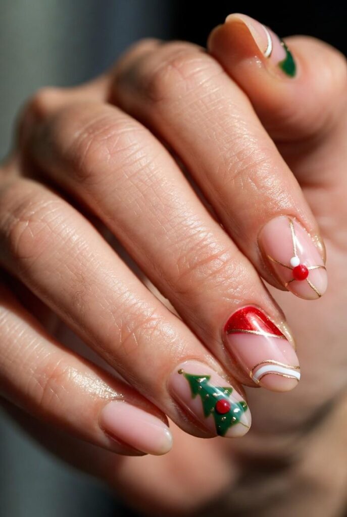 Soft nude nails feature bold red and green swirls, paired with one accent nail showcasing a glittery gold base. The glossy finish enhances the dimensional elements and festive energy.
