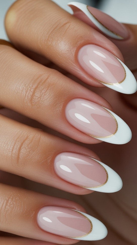 Crisp nude nails host bold white French tips, paired with one accent nail showcasing a gold stripe for extra sparkle. The glossy finish enhances the clean lines and festive charm.