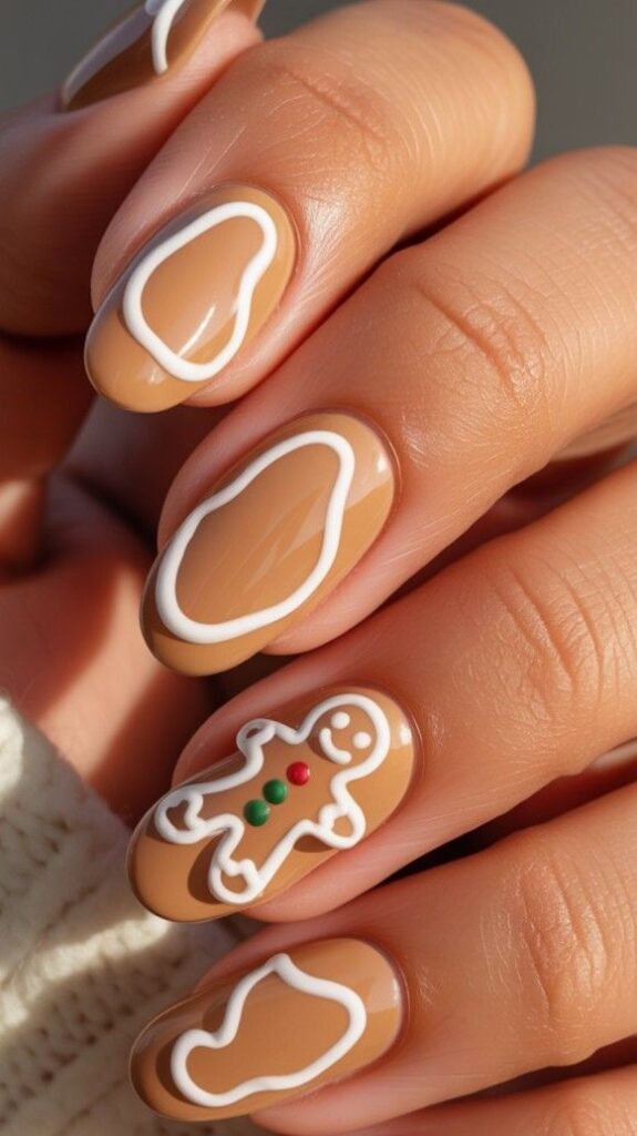 Soft brown nails feature a cute gingerbread man with icing outlines, paired with one accent nail showcasing a glittery gold base. The glossy finish enhances the playful, candy-inspired feel.