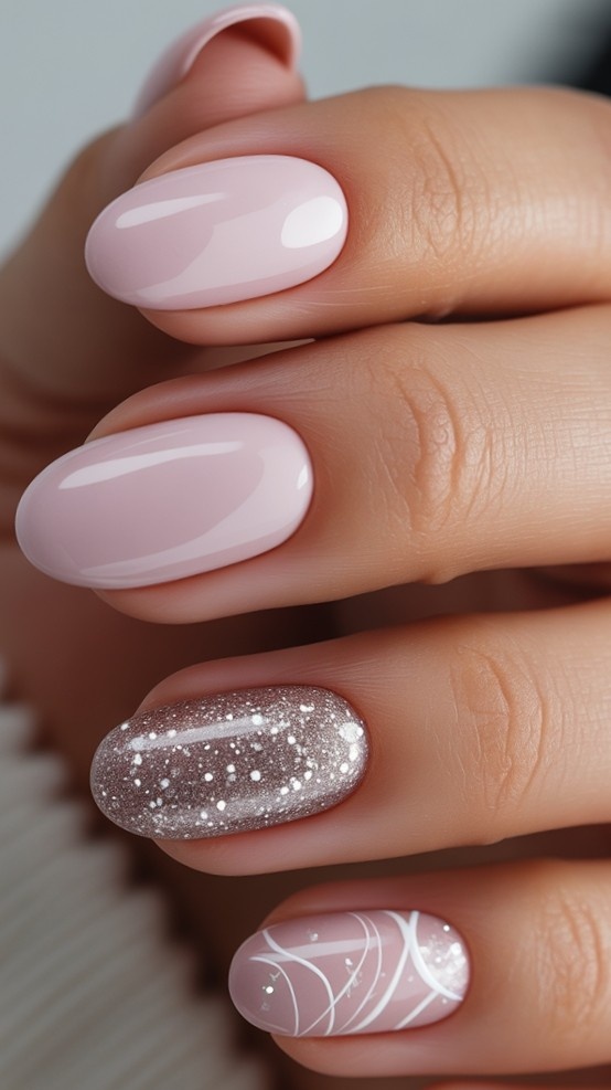 A chic, minimalist take on holiday nails, this design uses a long, almond shape to create an elongated, elegant silhouette. The base is a soft, milky pale pink polish, applied with a high-gloss finish for a smooth, sophisticated look. Two accent nails break the monotony: one features a dense silver glitter effect that shimmers like falling snow, while the other showcases delicate white swirls and tiny dots, reminiscent of frost patterns on a winter window. The overall effect is subtle, romantic, and effortlessly chic.