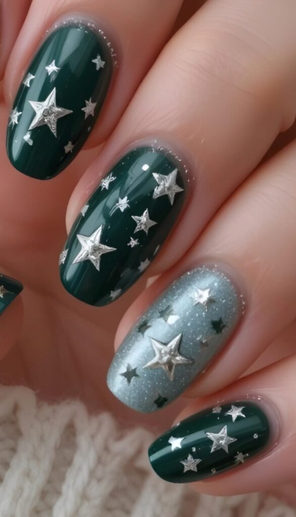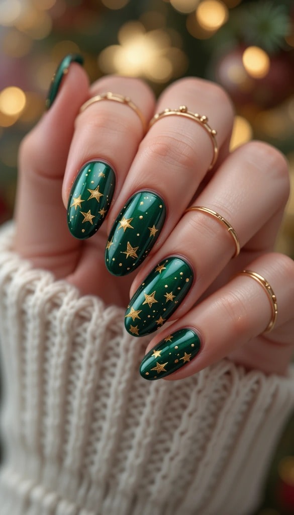 Rich emerald green nails feature large gold stars, creating a clean, elegant look. The glossy finish enhances the dimensional elements and festive energy.