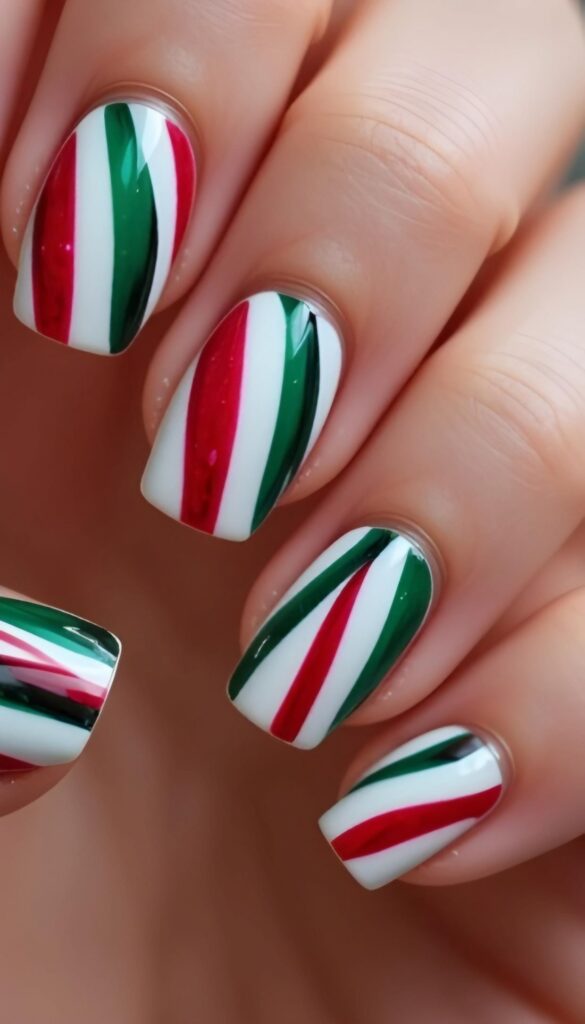 Crisp white nails feature bold red and green candy cane stripes, creating a clean, graphic look. The glossy finish enhances the contrast and festive energy.