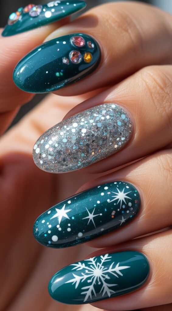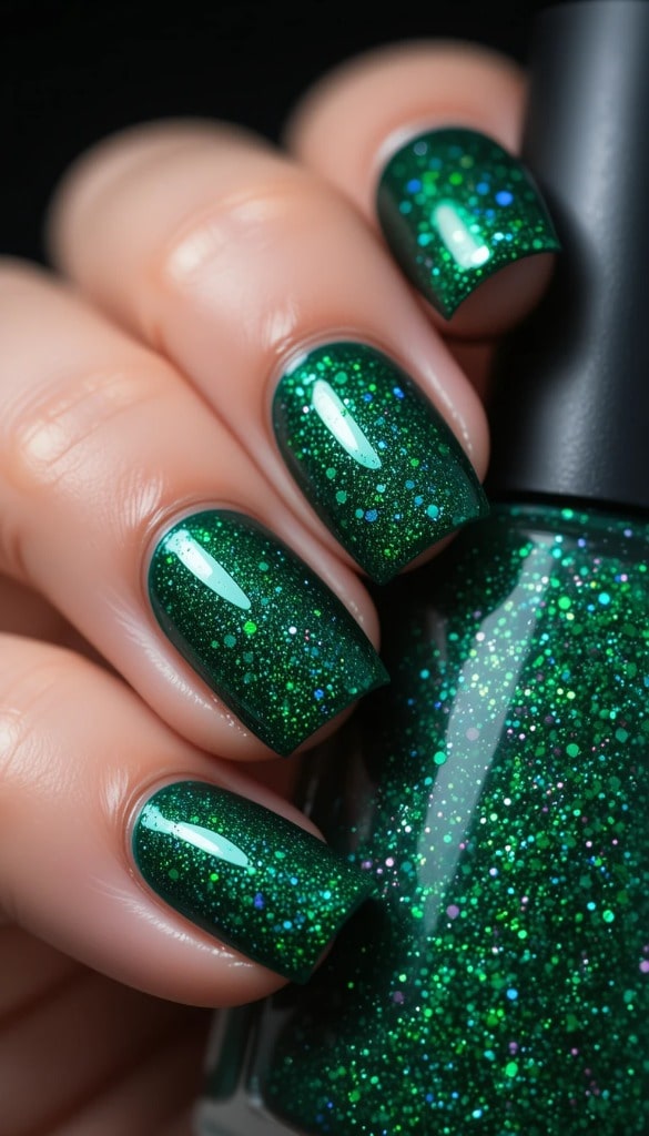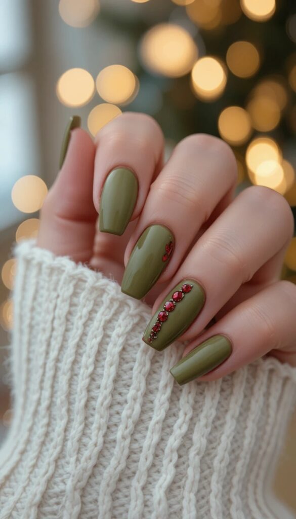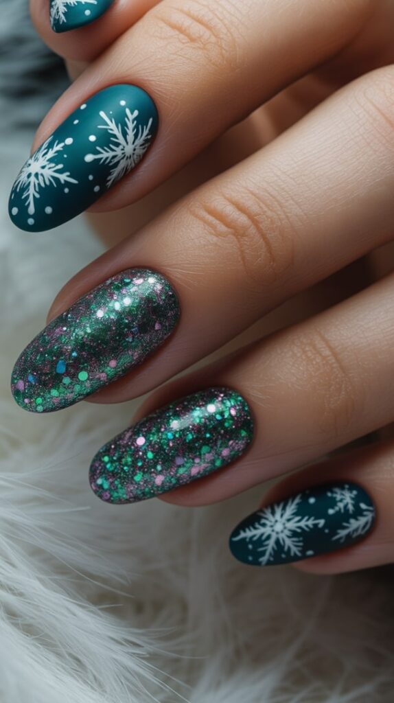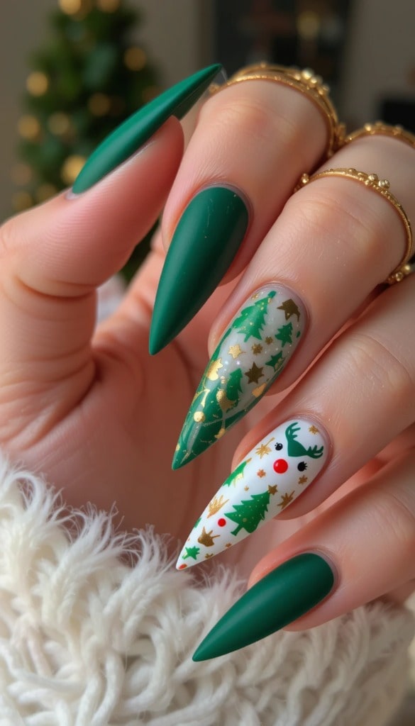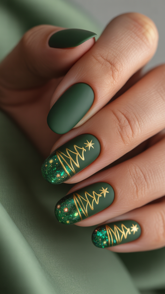 Green isn’t just a color — it’s the soul of Christmas. 🎄 In 2025, green Christmas nails are all about rich depth, festive charm, and timeless elegance. Think deep emerald bases with gold foil trees, glittery accents that shimmer like tinsel, delicate snowflakes, and playful holly leaves. Whether you’re heading to a formal dinner, an office party, or just want to feel fancy while sipping hot cocoa, there’s a design here for every mood: understated glam, playful cheer, or sophisticated sparkle.