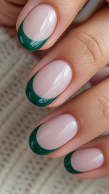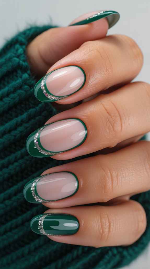 Soft nude nails feature crisp green French tips, paired with one accent nail showcasing a glittery green base. The glossy finish enhances the clean lines and festive charm, creating a refined, holiday-ready look.