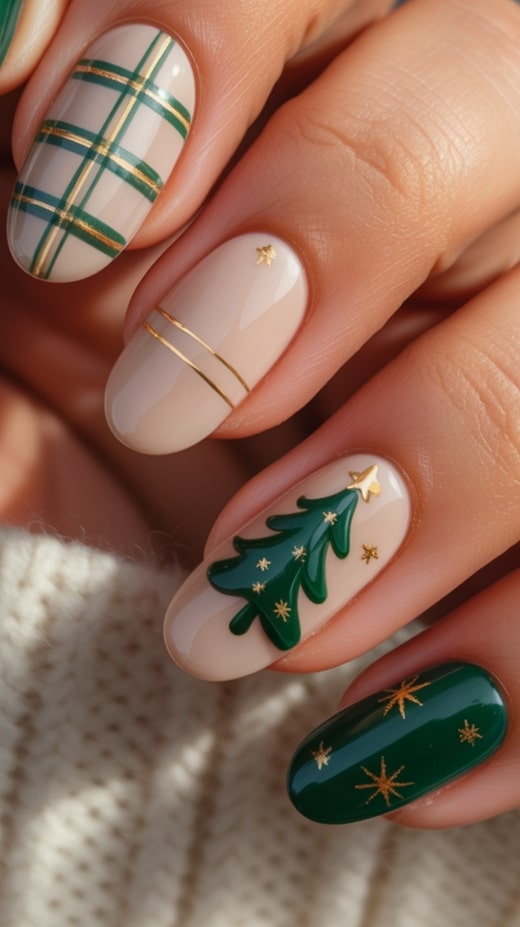 Crisp nude nails feature delicate green-and-gold plaid patterns, while one accent nail showcases a green Christmas tree with gold stars. The glossy finish enhances the clean lines and autumnal feel.