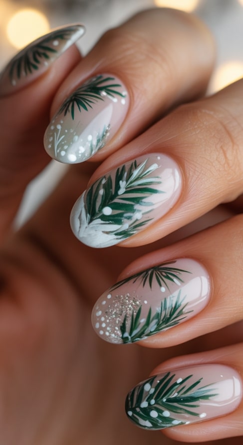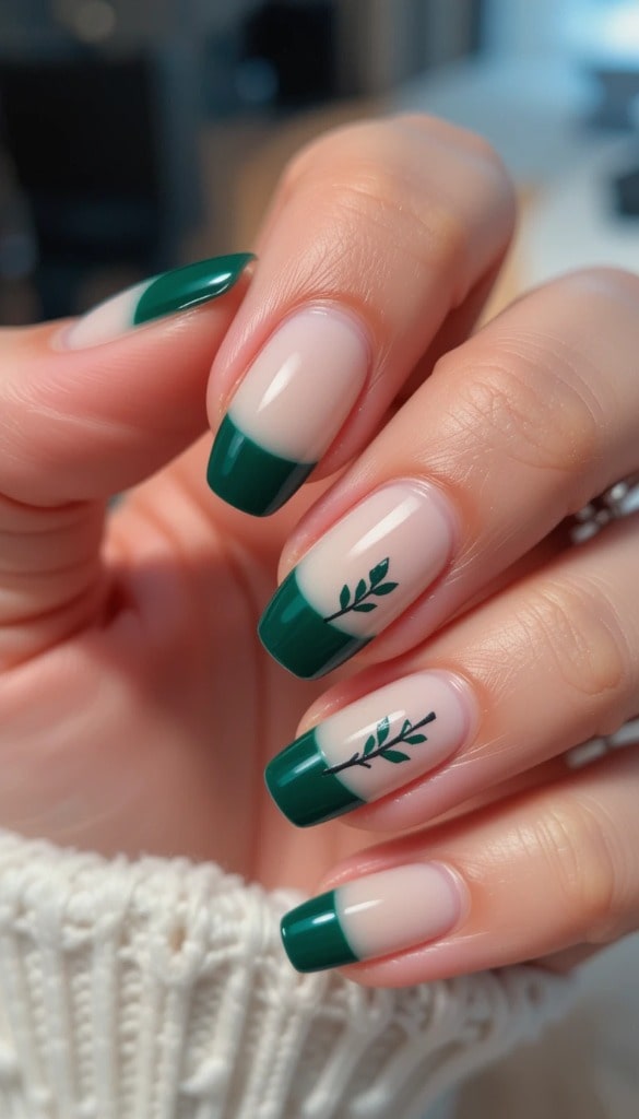 This sophisticated design features a clean, glossy nude base paired with a crisp deep emerald green French tip on each nail. The look is elevated by two accent nails adorned with delicate, hand-painted dark green leaf sprigs, evoking the timeless elegance of winter foliage or mistletoe. The minimalist approach and soft color palette create a chic, modern alternative to traditional red-and-green holiday nails. The glossy finish unifies the design and adds a touch of luxury.