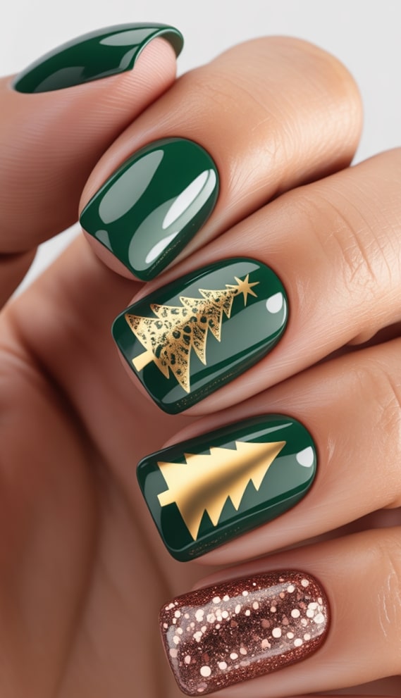 Rich emerald green nails feature gold tree decals with glitter accents, paired with one accent nail showcasing a glittery green base. The glossy finish enhances the dimensional elements and festive energy.