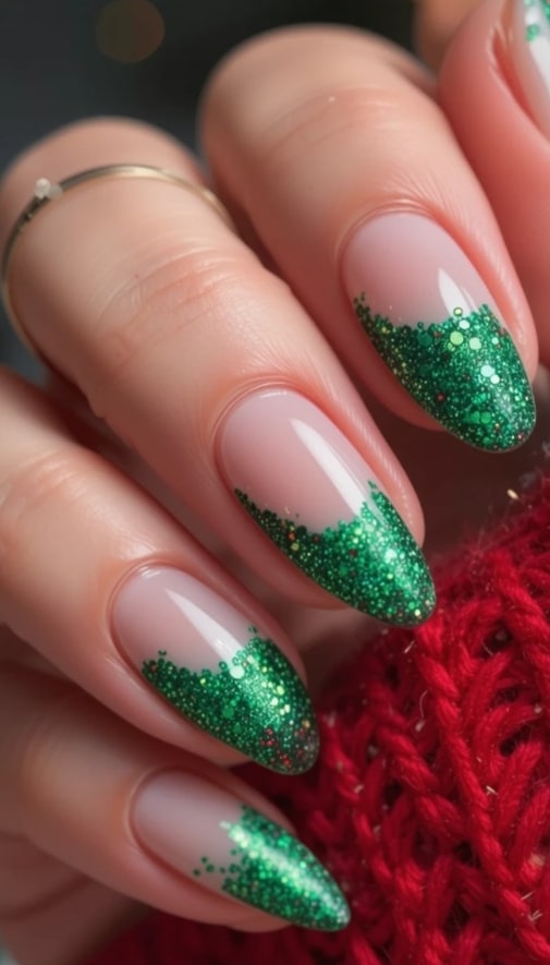 Soft nude nails feature bold green glitter tips, paired with one accent nail showcasing a glittery green base. The glossy finish enhances the dimensional elements and festive energy.
