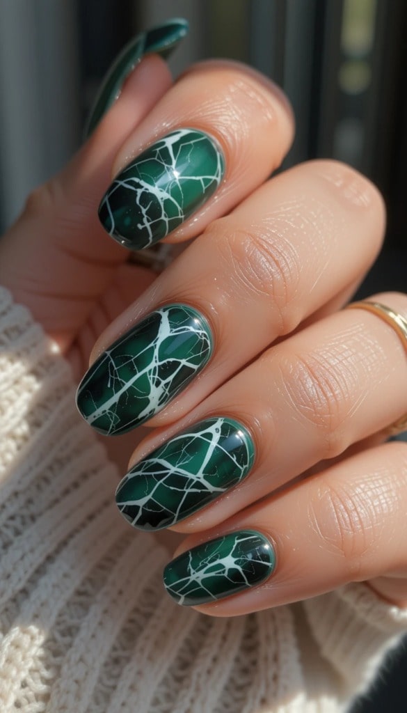 Rich emerald green nails feature delicate white veining, mimicking the look of marble or cracked ice. The glossy finish enhances the dimensional elements and festive energy.