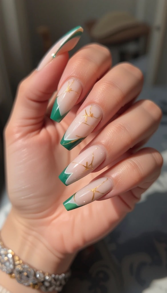 Rich emerald green nails feature delicate gold leaf decals, creating a clean, elegant look. The glossy finish enhances the dimensional elements and festive energy.