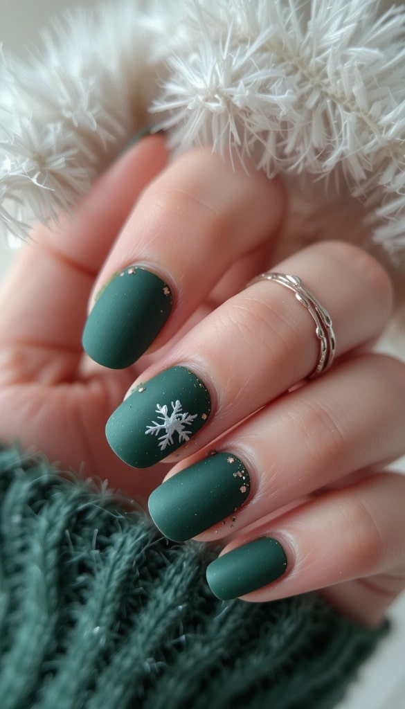 Rich emerald green nails feature large white snowflakes, creating a clean, elegant look. The glossy finish enhances the dimensional elements and festive energy.