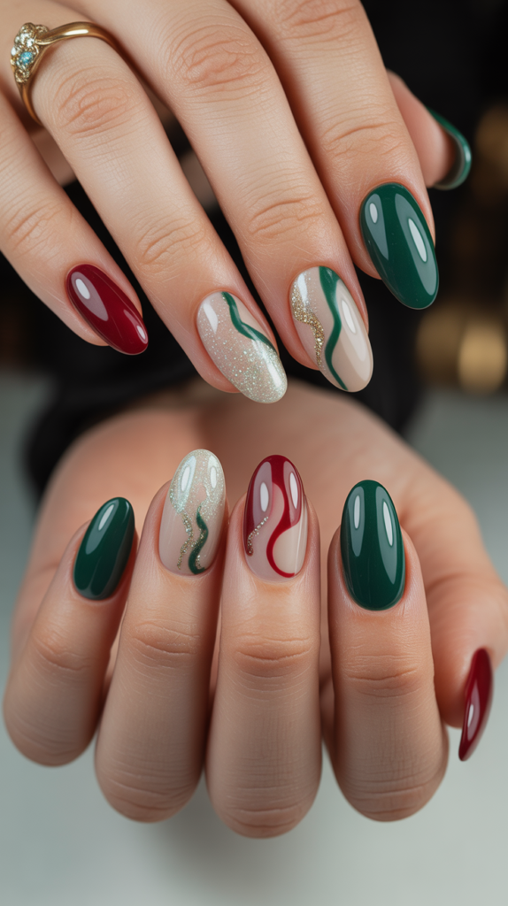 Soft nude nails feature bold red and green swirls, paired with one accent nail showcasing a glittery green base. The glossy finish enhances the dimensional elements and festive energy.