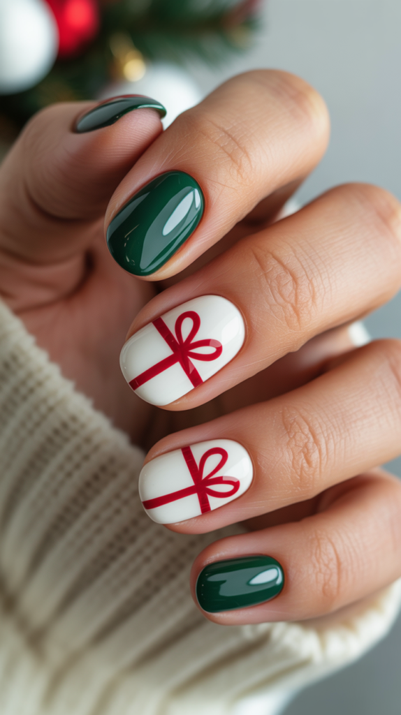 Crisp white nails host bold red bows, paired with rich emerald green accent nails. The glossy finish makes the contrast pop with festive energy.