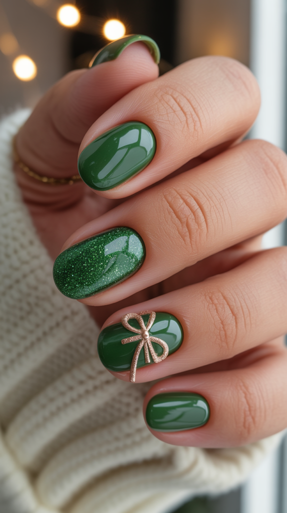 Rich emerald green nails feature a glittery green accent nail, paired with one accent nail showcasing a gold bow with glitter accents. The glossy finish enhances the sparkle and charm, creating a playful, festive look.