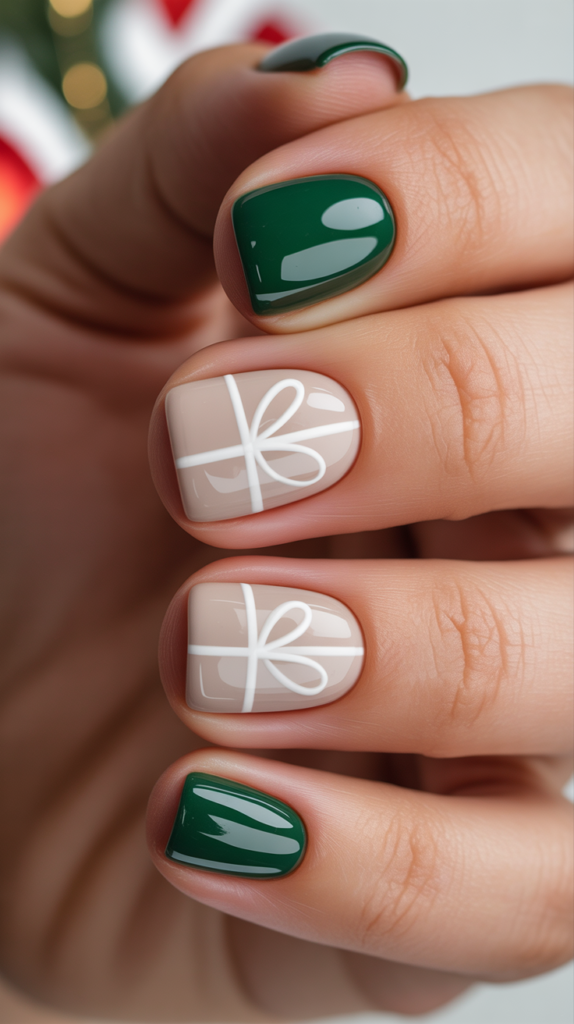 Crisp white nails host bold white bows, paired with rich emerald green accent nails. The glossy finish makes the contrast pop with festive energy.