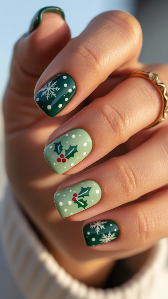 Soft green nails feature delicate white snowflakes and green holly leaves with red berries. The glossy finish enhances the clean lines and festive charm, creating a refined, holiday-ready look.