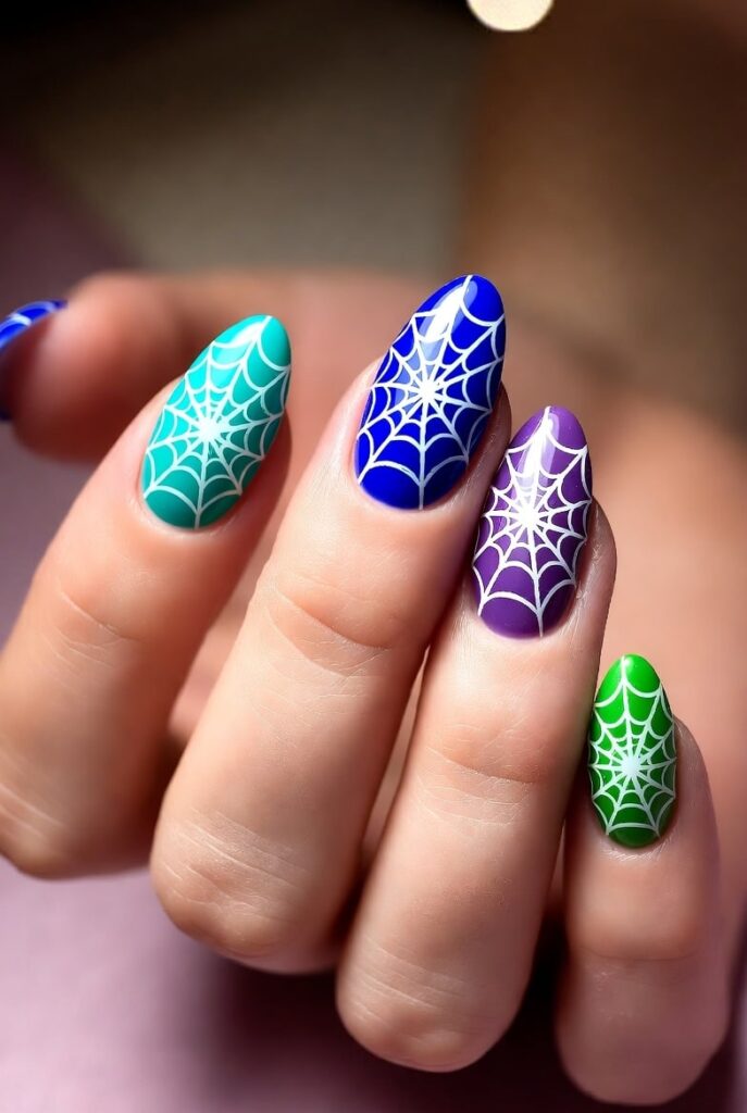 Vibrant blue, green, and purple nails host intricate white spiderwebs — each nail features a bold color block. The glossy finish enhances the chaos, while the coffin shape keeps it wearable. It’s messy, bold, and totally unforgettable.