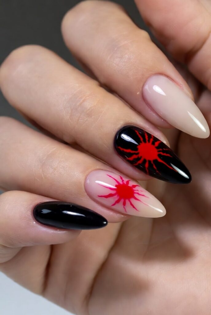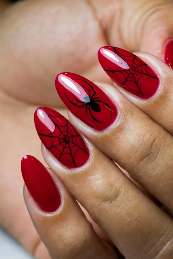 Soft nude nails host intricate red spiderwebs — one nail features a bold red accent for instant sparkle. The glossy finish enhances the pop, while the coffin shape adds edge. It’s moody, elegant, and full of autumnal soul.