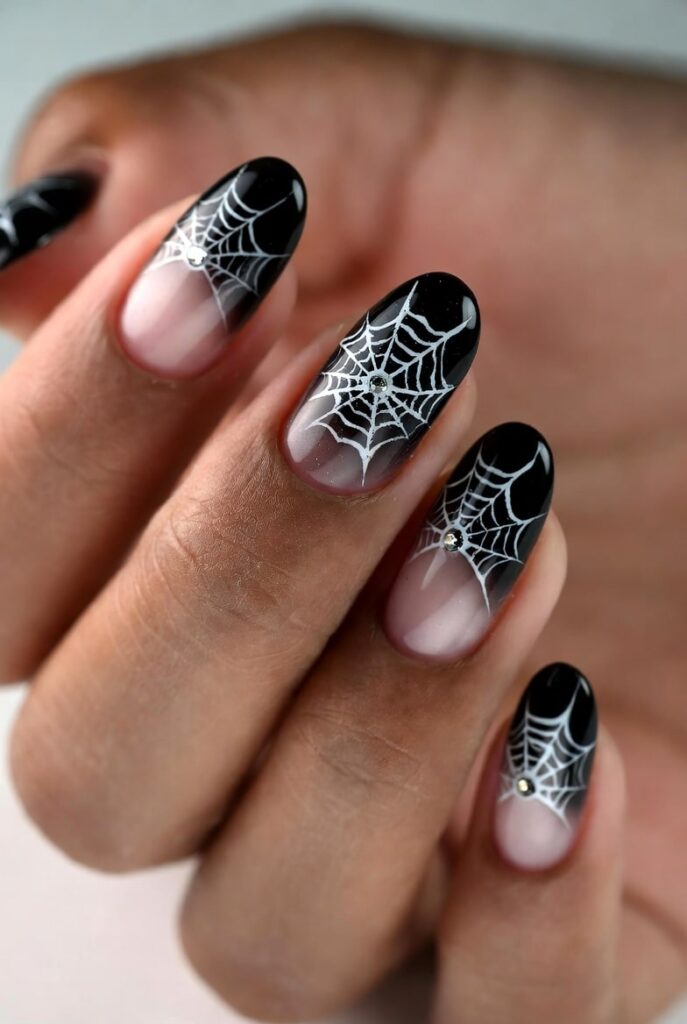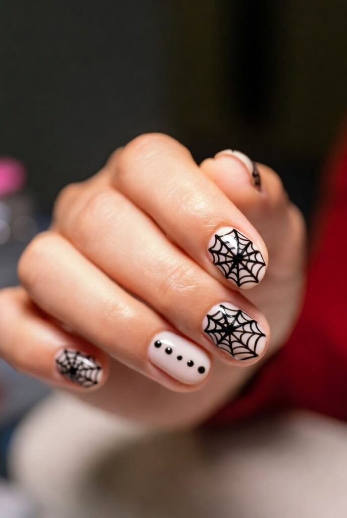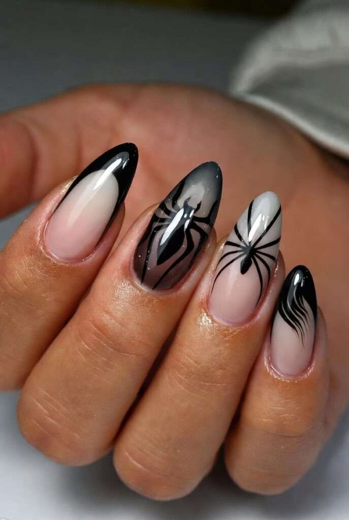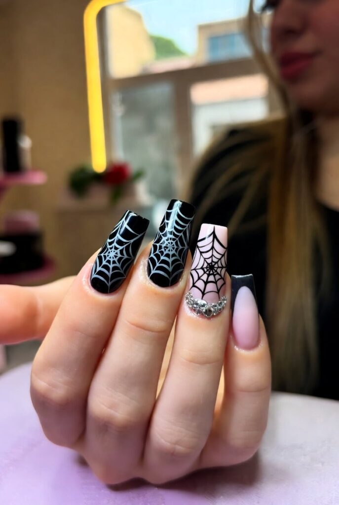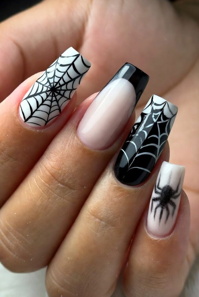 23) Black & Nude Nails with Spiderweb & Spider Accents