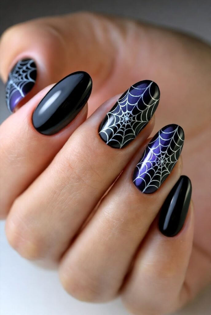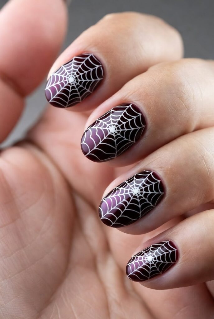 11) Deep Purple & Black Nails with White Spiderweb Accents