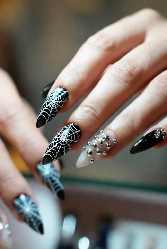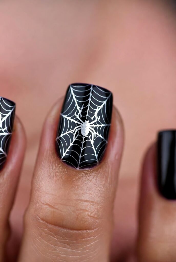 15) Black Nails with Silver Spiderweb & Spider Accents