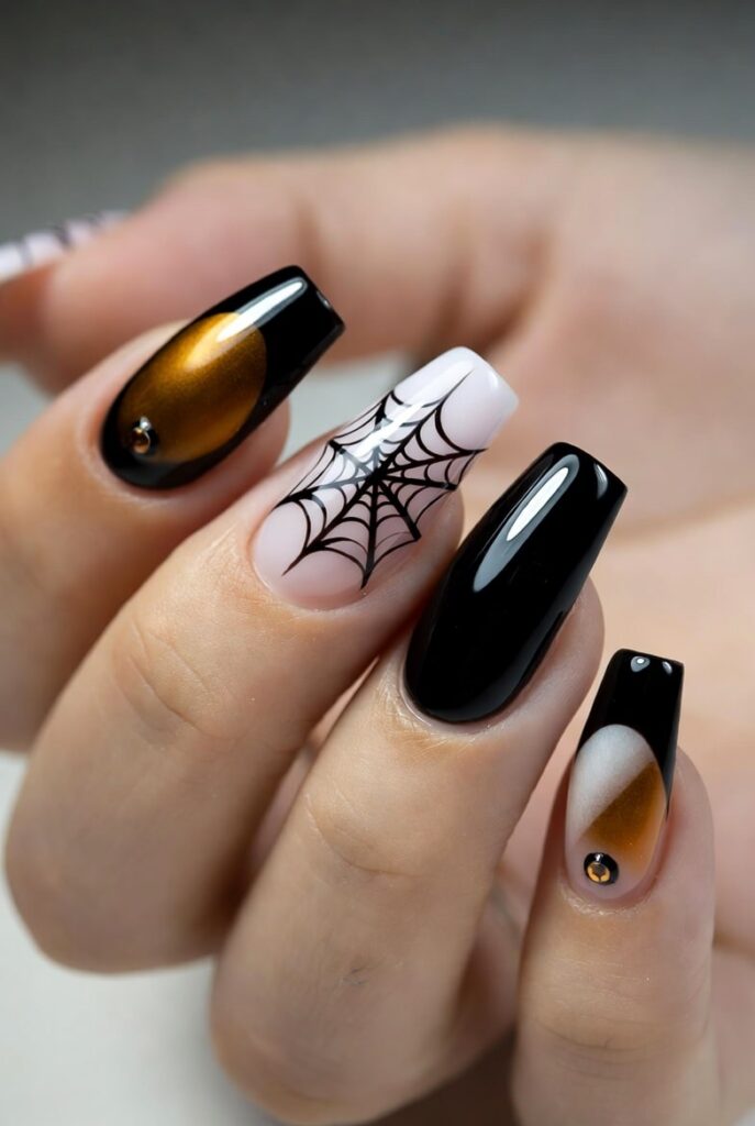 Glossy black nails host delicate white spiderwebs — two nails feature bold gold accents for instant sparkle. The glossy finish enhances the contrast, while the coffin shape adds sleekness. It’s not just cute… it’s festively iconic.