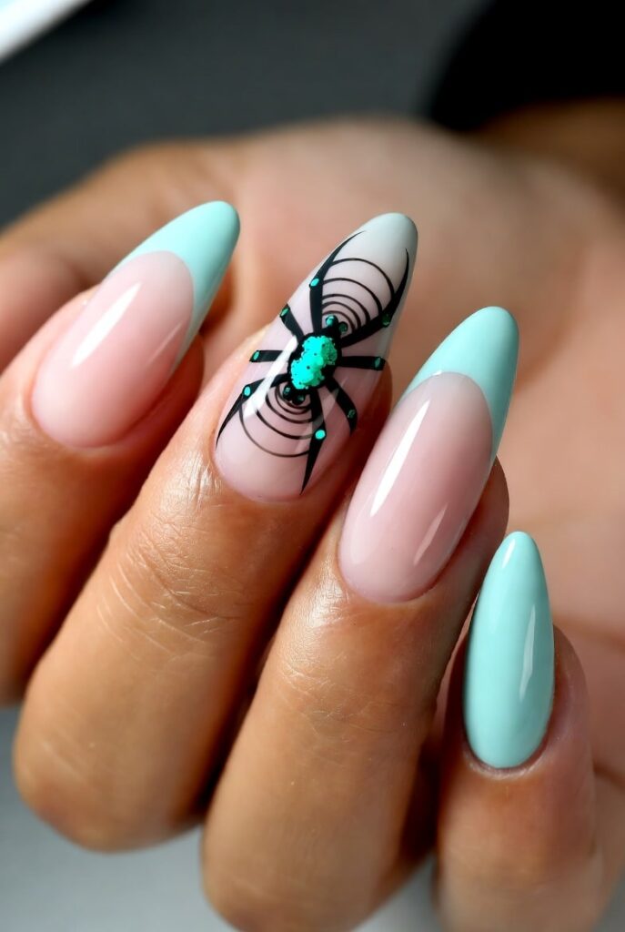 Soft pink and mint nails host delicate black spider motifs — one nail features a glittery teal accent for instant sparkle. The glossy finish enhances the pop, while the coffin shape adds edge. It’s sweet, sassy, and full of Halloween mischief.