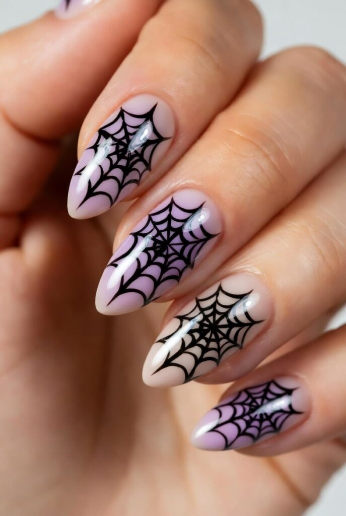 Soft lavender nails host intricate black spiderwebs — some large, some tiny, all perfectly placed. The glossy finish enhances the depth, while the coffin shape adds edge. It’s moody, elegant, and full of autumnal soul.