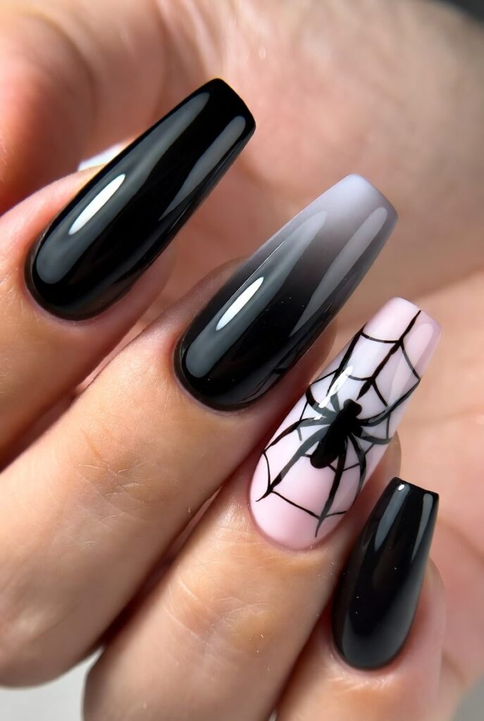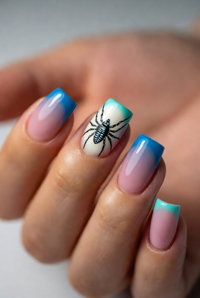 Soft pink and blue nails fade into deep teal at the tips — each nail features a delicate black spider motif. The glossy finish enhances the contrast, while the coffin shape adds sleekness. It’s artistic, moody, and full of otherworldly soul.