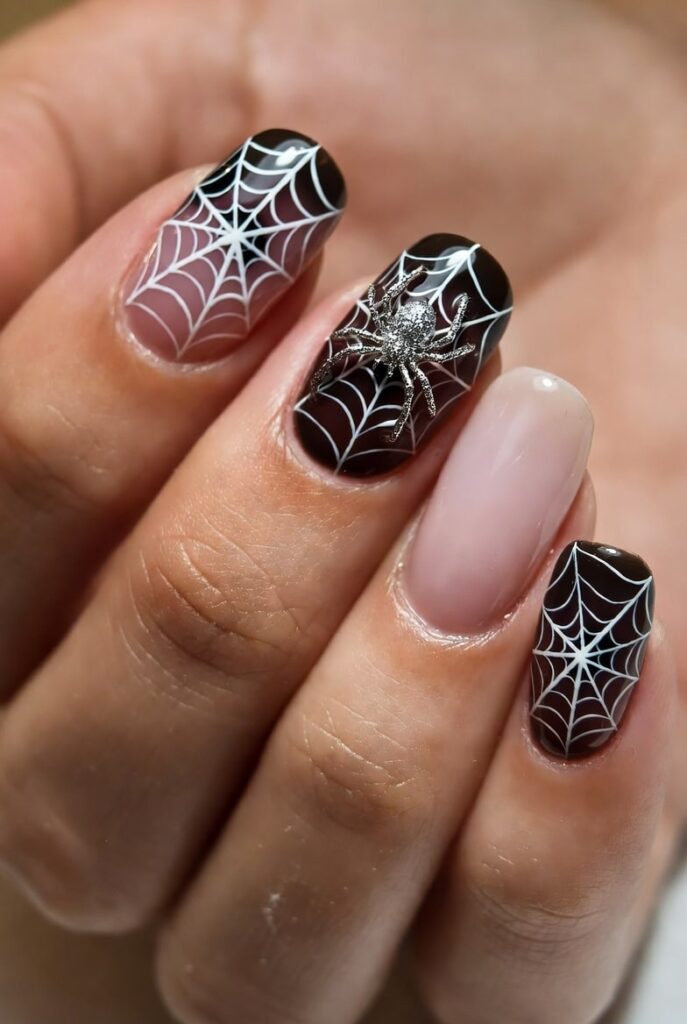 21) Black & Nude Nails with Silver Spiderweb & Glitter Spider Accents