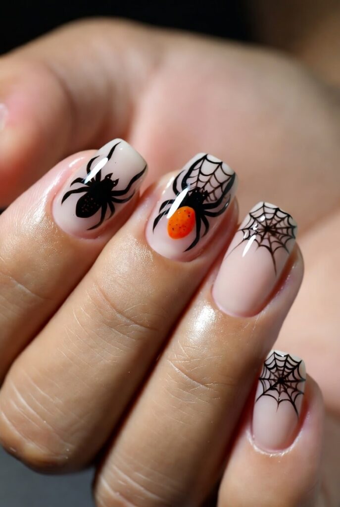 12) Nude Nails with Black Spiderweb & Spider Accents