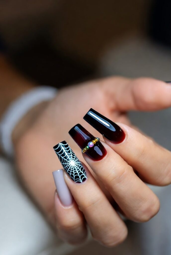 Rich burgundy nails fade into deep black at the tips — one nail features a delicate white spiderweb pattern, another a cascade of tiny rainbow beads. The glossy finish enhances the contrast, while the coffin shape adds sleekness. It’s moody, elegant, and full of autumnal soul.