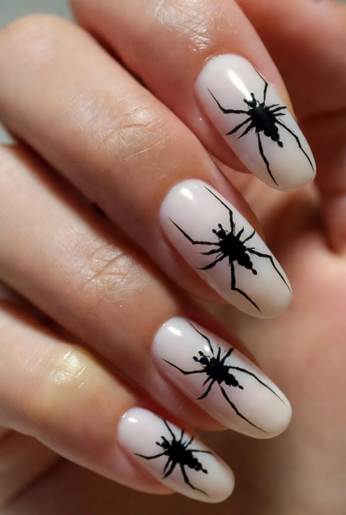 Crisp white nails host delicate black spider motifs — some floating solo, others peeking out from behind tiny legs. The glossy finish enhances the fun, while the almond shape keeps it modern and wearable. It’s not just spooky… it’s playfully mischievous.