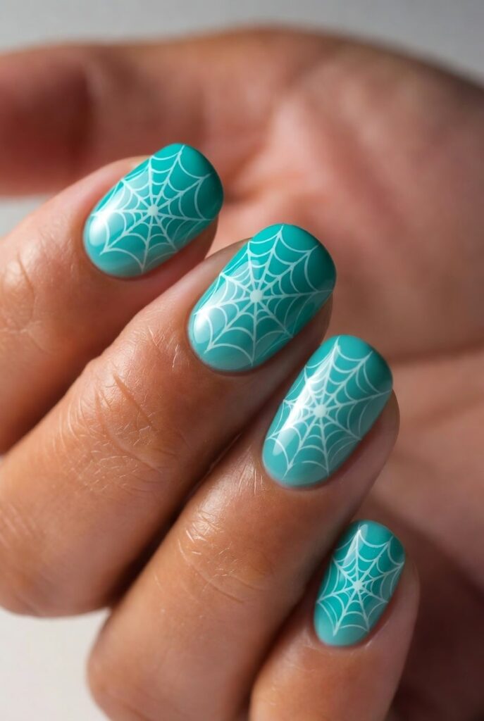 Vibrant teal nails host intricate white spiderwebs — some large, some tiny, all perfectly placed. The glossy finish enhances the depth, while the coffin shape adds edge. It’s artistic, moody, and full of otherworldly soul.