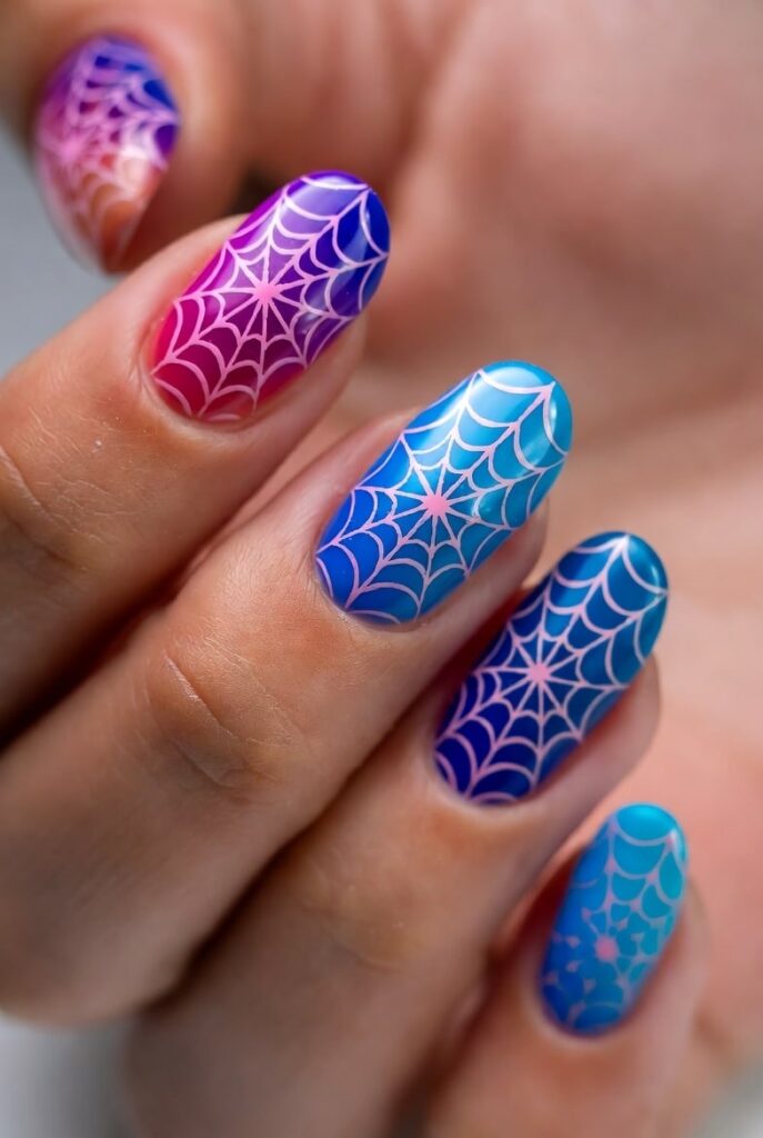 Vibrant blue, pink, and purple nails host intricate white spiderwebs — each nail features a bold gradient. The glossy finish enhances the chaos, while the coffin shape keeps it wearable. It’s messy, bold, and totally unforgettable.