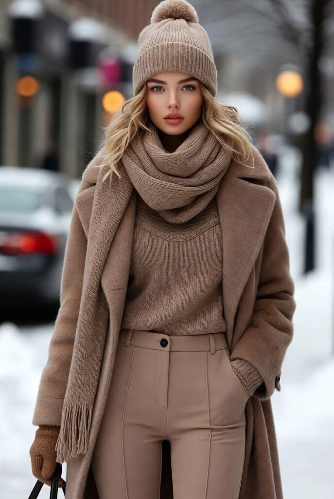 “Classic beige wool trench coat belted at the waist, layered over a ribbed turtleneck and matching pants. Styled with a chunky knit scarf and fingerless gloves — clean, elegant, and perfect for everyday wear.”