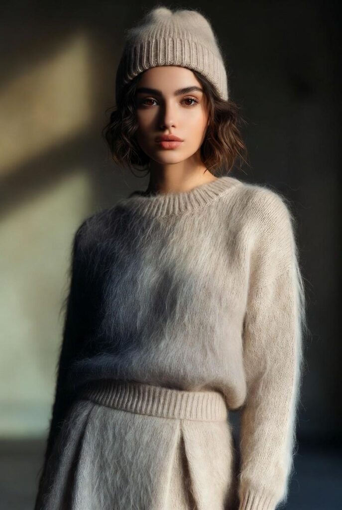 “Soft beige fuzzy knit set (sweater + matching pants) in an oversized fit, styled with minimal accessories and bare feet — clean, modern, and perfect for lounging at home or running quick errands.”