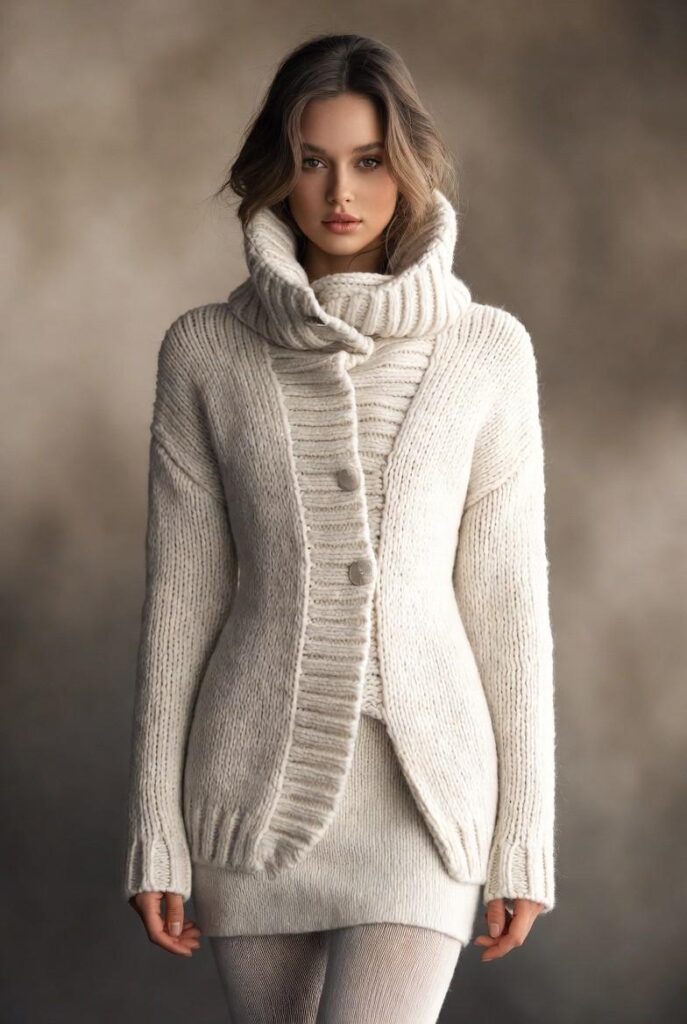 “Oversized cream knit sweater paired with wide-leg beige trousers and a chunky knit scarf. Styled with ankle boots and a messy bun — casual, cool, and totally Instagram-worthy.”