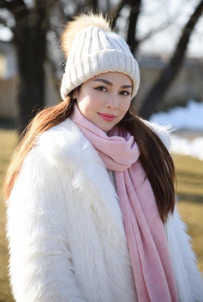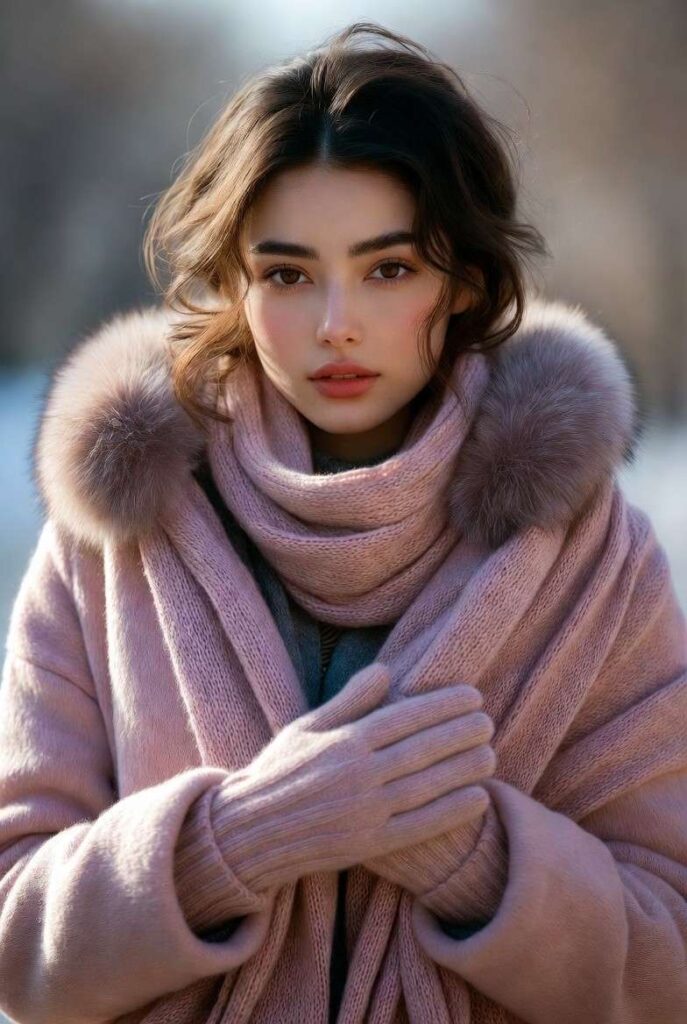 “Plush white faux fur coat frames a soft pink knit scarf, paired with a matching knit beanie — sweet, serene, and totally wearable. Styled with minimal accessories for that ‘just stepped out of a snow globe’ vibe.”