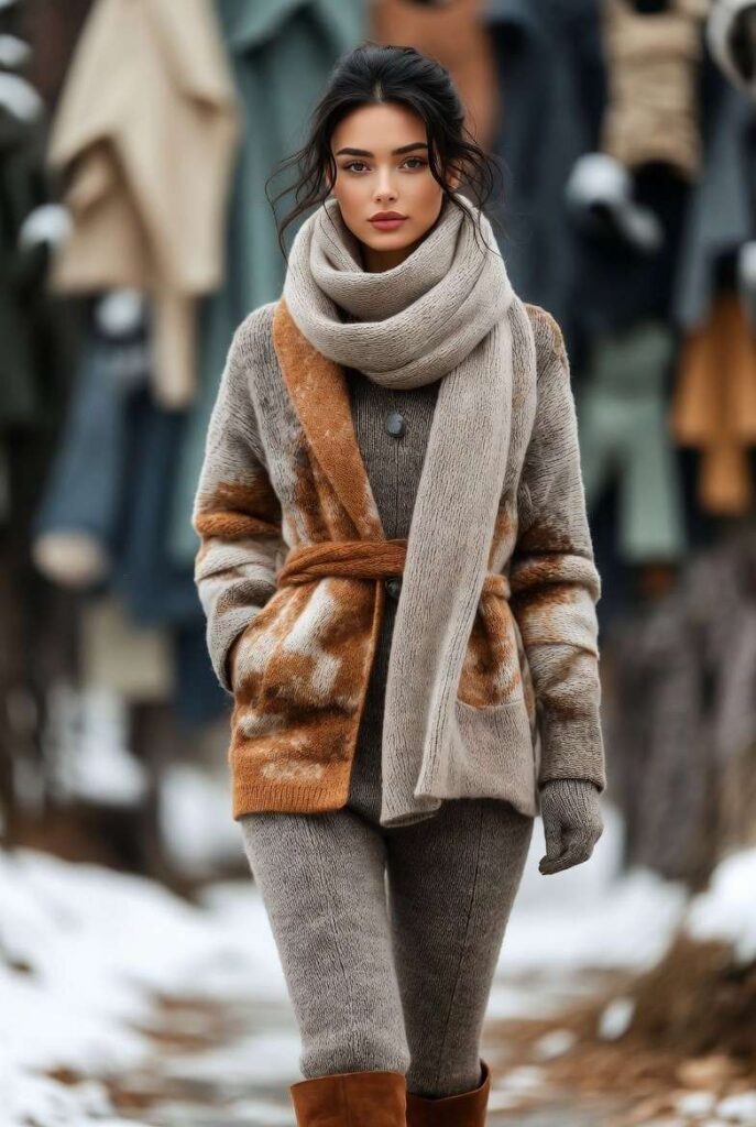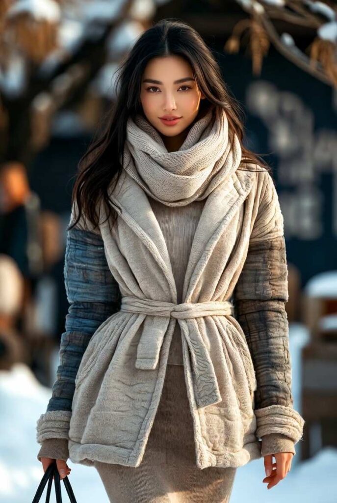 “Oversized brown and cream color-block coat belted at the waist, layered over a ribbed grey sweater and matching pants. Styled with a chunky knit scarf and fingerless gloves — clean, elegant, and perfect for everyday wear.”