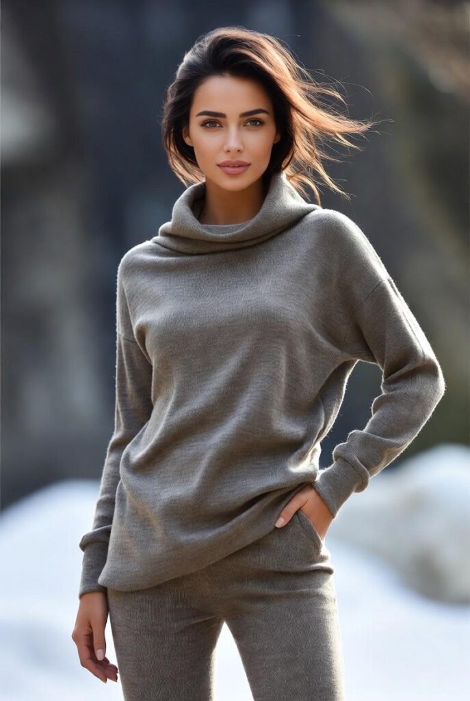 Soft grey knit set (sweater + matching pants) in an oversized fit, styled with minimal accessories and bare feet — clean, modern, and perfect for lounging at home or running quick errands.”