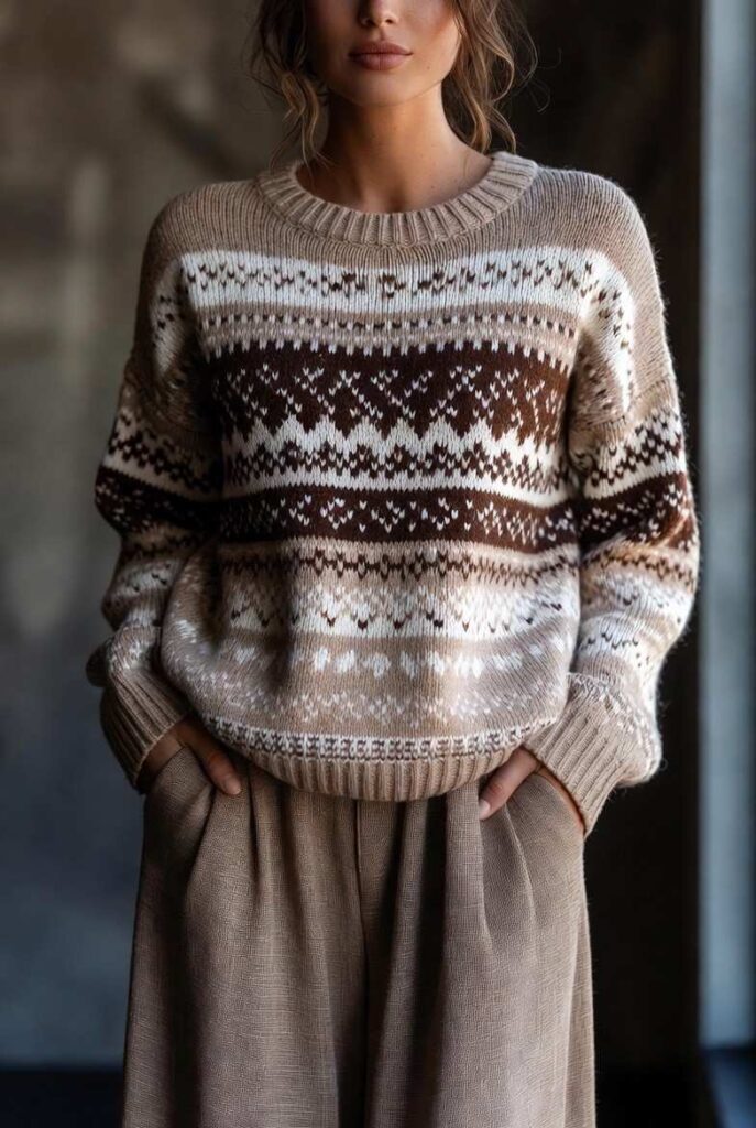 “Classic fair isle sweater in brown and white, belted at the waist with a brown leather belt. Paired with wide-leg beige trousers and ankle boots — casual, cool, and totally Instagram-worthy.”