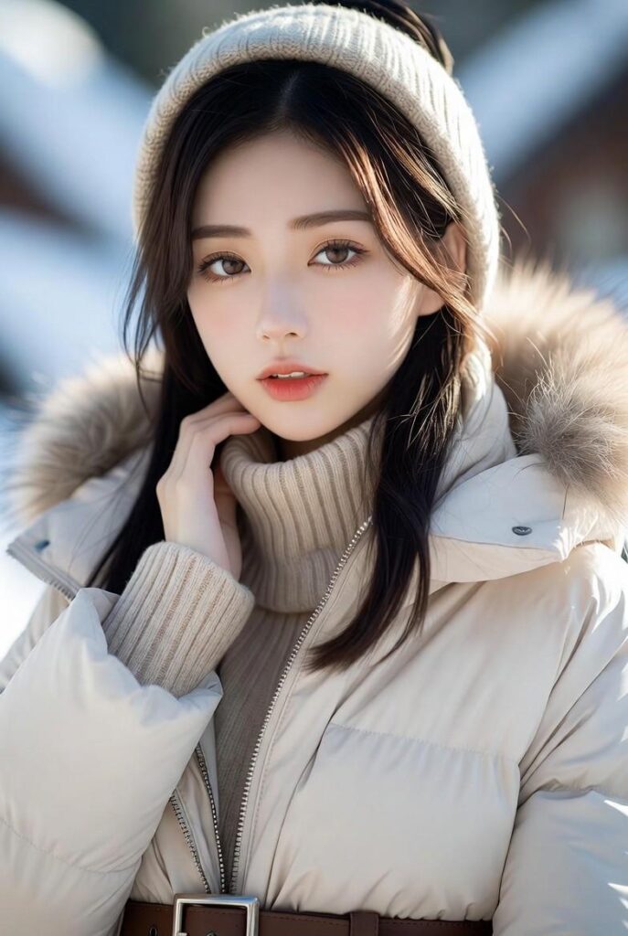 “Cream puffer coat with a plush faux fur hood frames a ribbed turtleneck sweater, belted at the waist with a brown leather belt. Styled with a matching knit beanie — cozy, romantic, and totally photo-ready.”