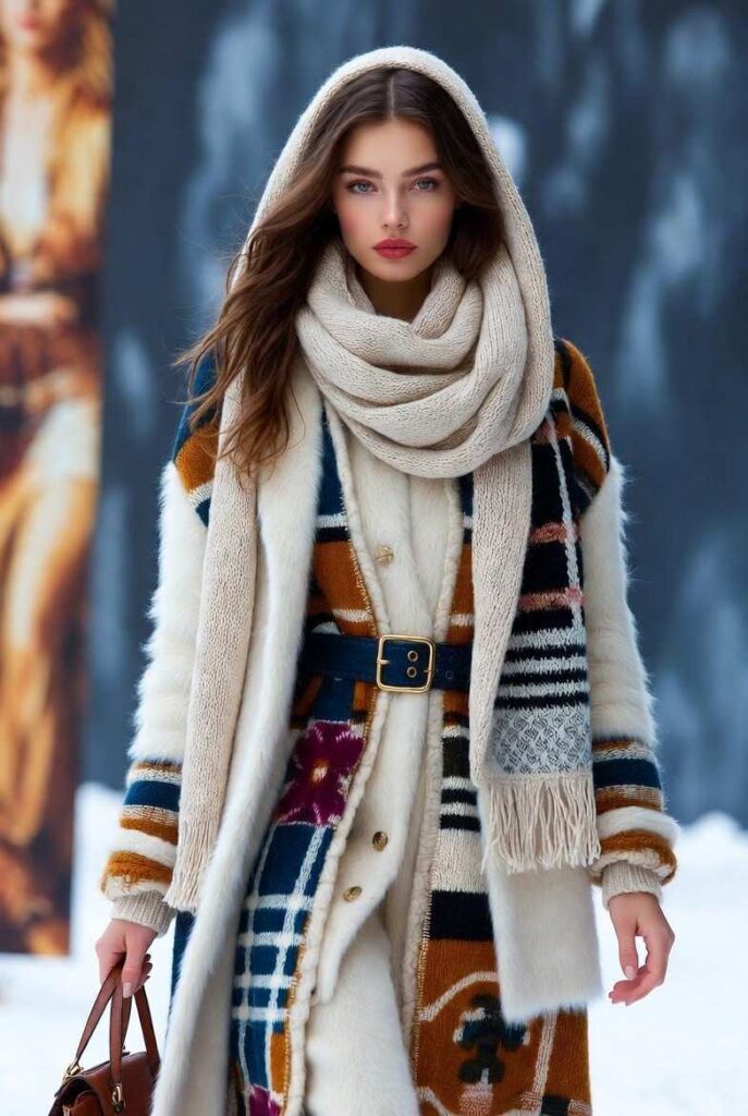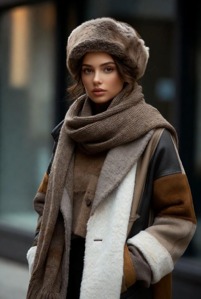 “Plush faux fur hat frames a stylish leather and fur coat in brown and white, paired with a chunky knit scarf and dark jeans. Styled with minimal accessories — bold, modern, and totally street-style ready.”