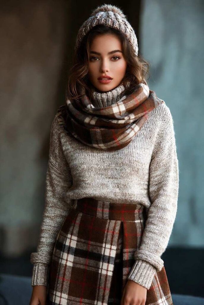 “Cream knit sweater paired with a classic plaid skirt in brown and red, styled with a matching plaid scarf and knit beanie — sweet, serene, and totally wearable.”