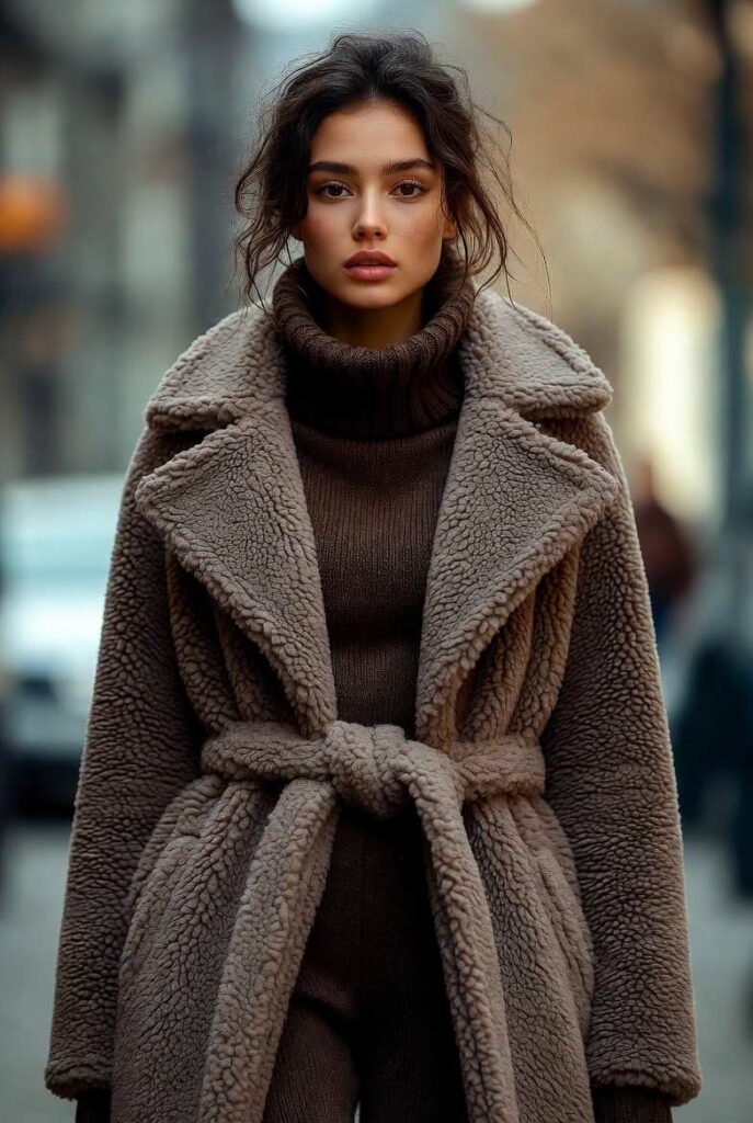 “Soft beige shearling coat with a tied belt, layered over a ribbed brown turtleneck and matching pants. Styled with minimal accessories — clean, classic, and totally low-key — chic, understated, and perfect for everyday wear.”