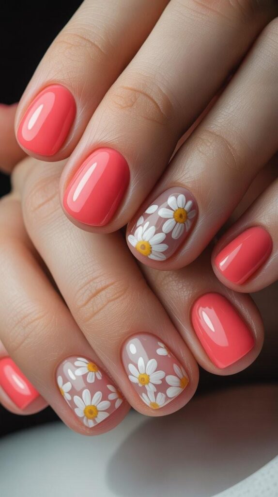 Glossy short oval nails in warm coral finish, two accent fingers adorned with scattered hand-painted white daisies (yellow centers) and fine green vine details. The high-shine surface makes the color glow like sunset light, and the oval shape ensures comfort and elegance. Bright, clean, and full of joyful simplicity—like a fresh start, polished.